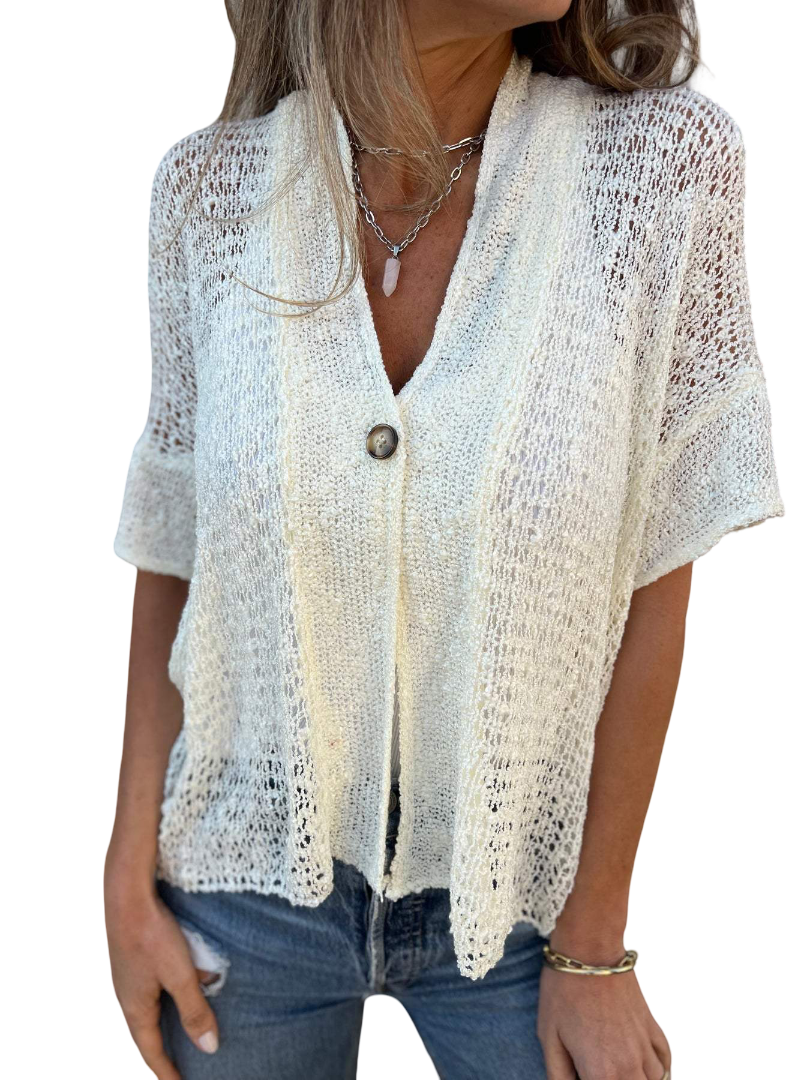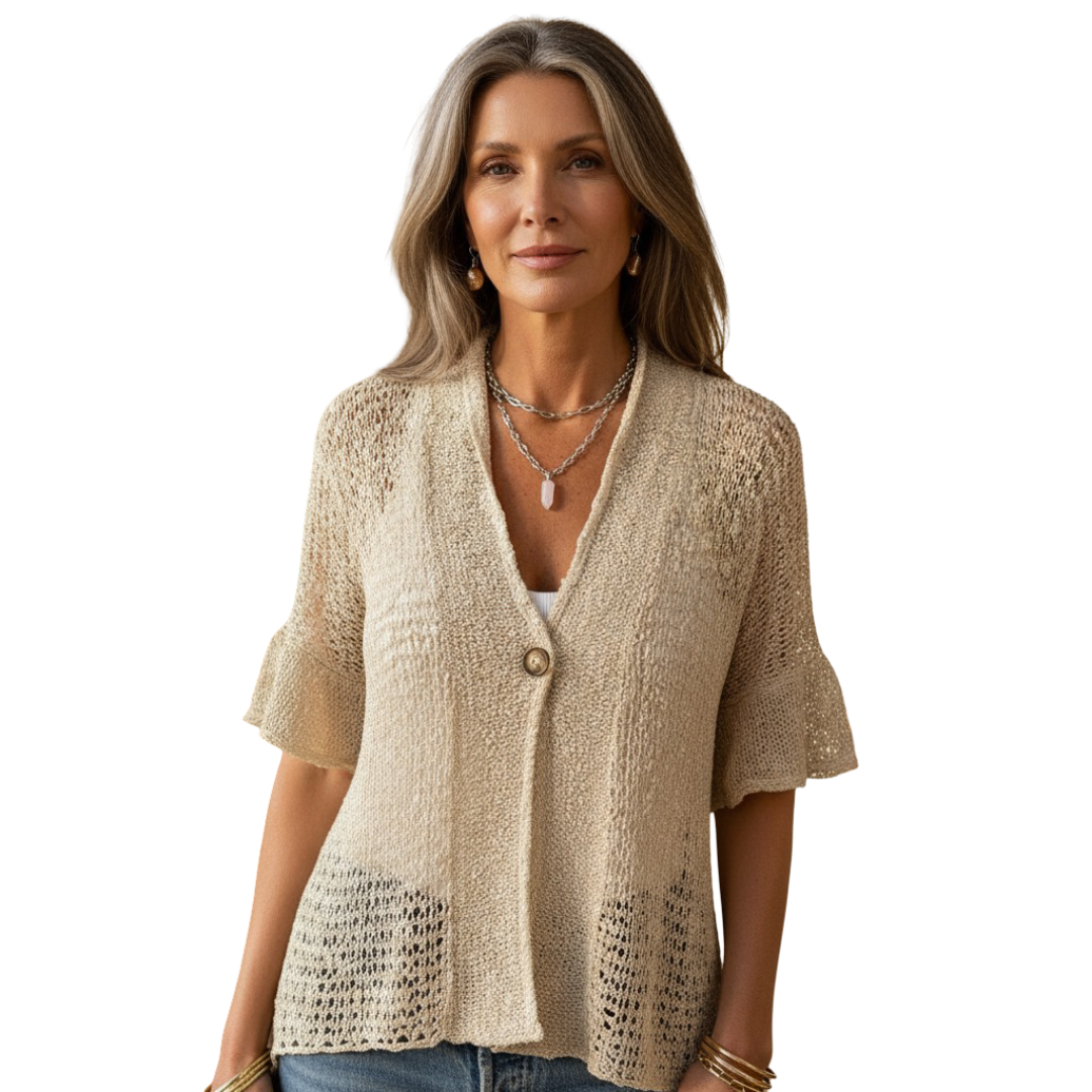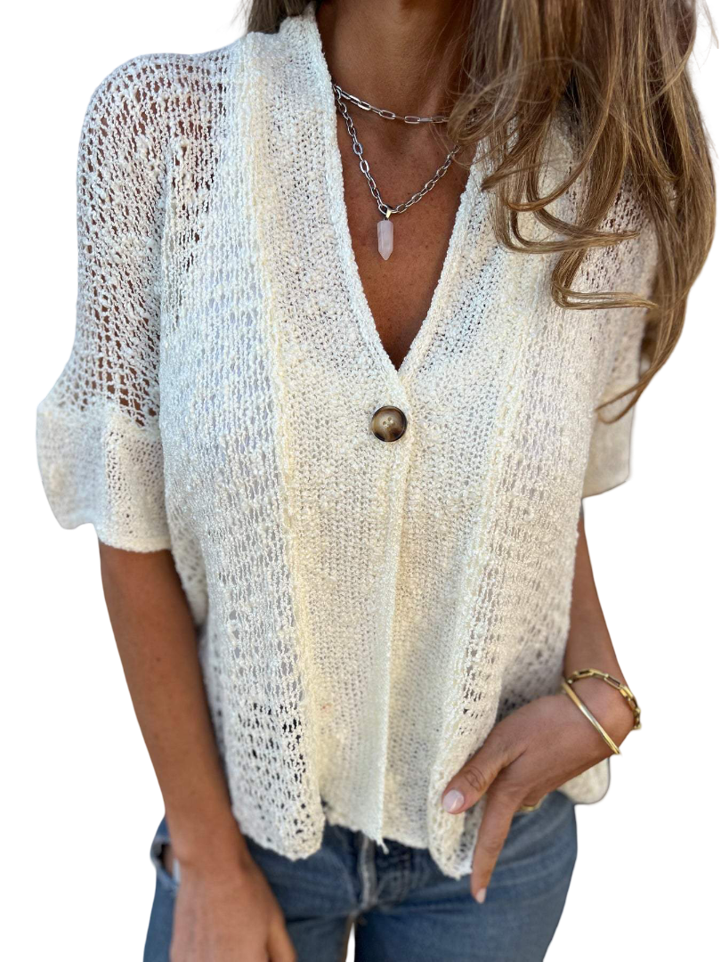 הטופ האלגנטי עם מרקם של איווני מביא נגיעה של קסם מוקפד למלתחה היומיומית שלכם. עם דוגמת סריגה עדינה והתאמה מחמיאה, הטופ הזה מעוצב לסגנון קליל ונצחי.