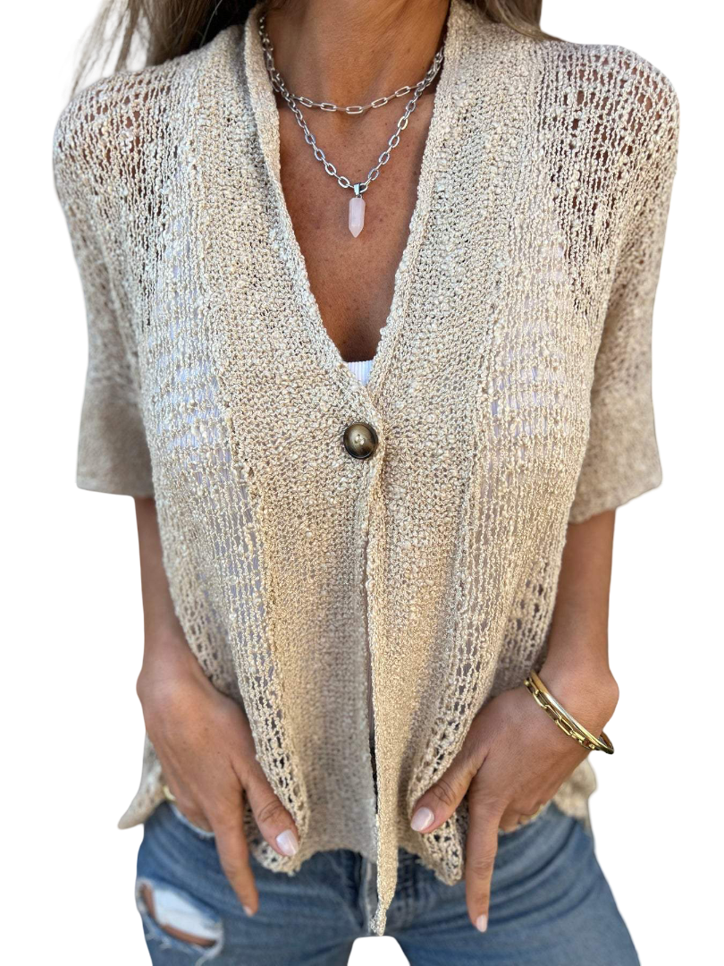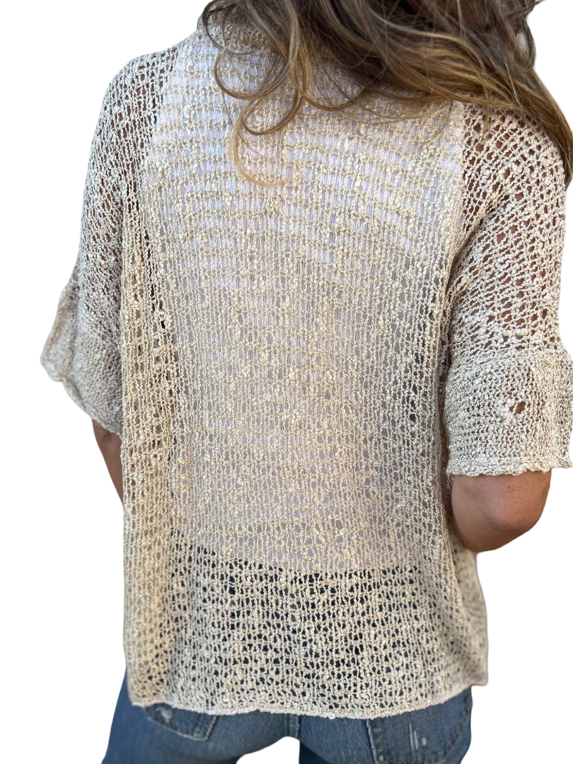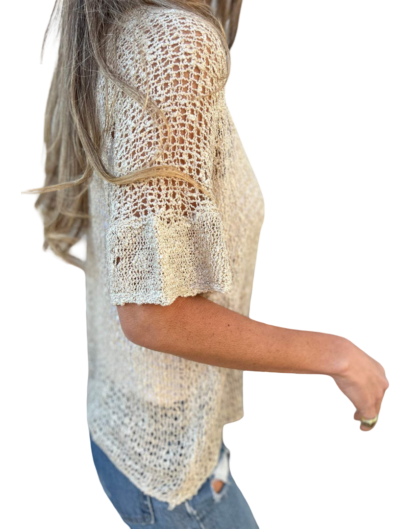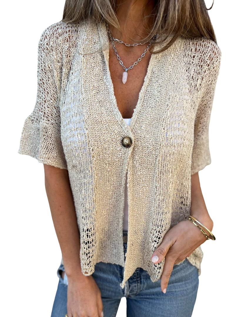 הטופ האלגנטי עם מרקם של איווני מביא נגיעה של קסם מוקפד למלתחה היומיומית שלכם. עם דוגמת סריגה עדינה והתאמה מחמיאה, הטופ הזה מעוצב לסגנון קליל ונצחי.