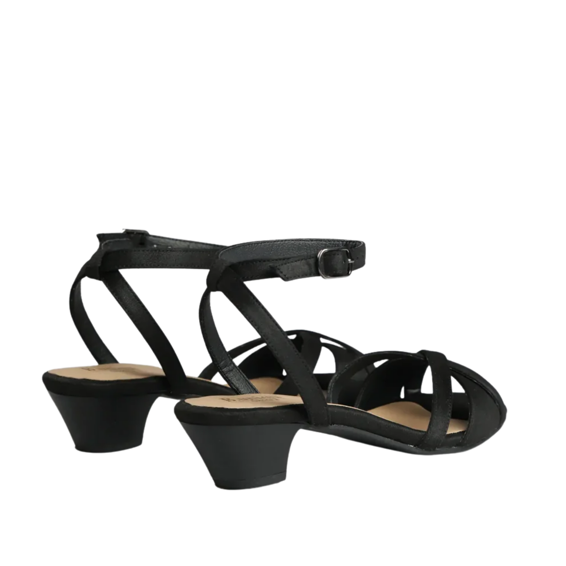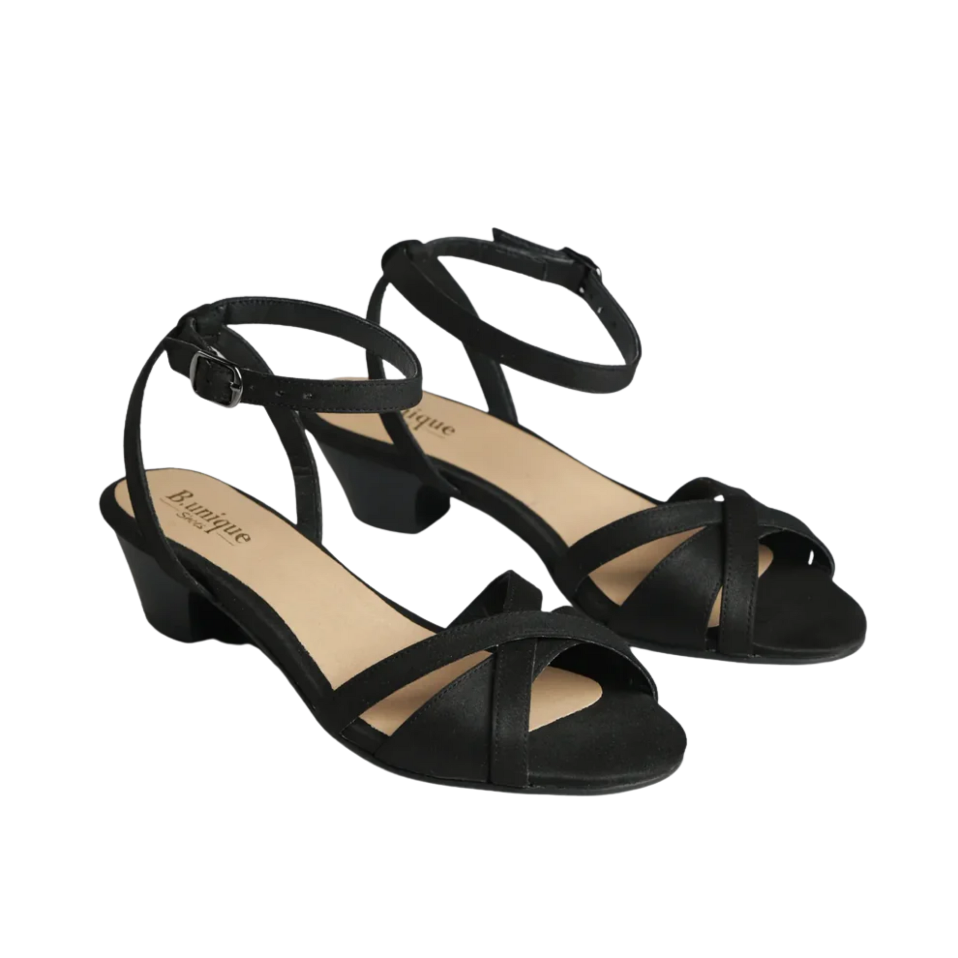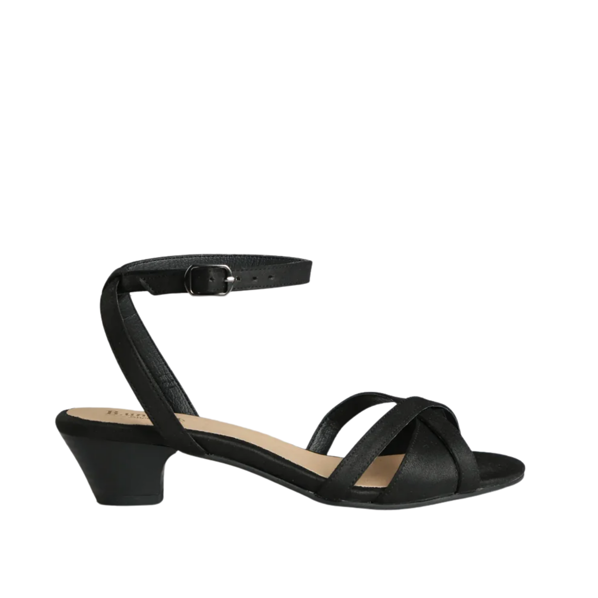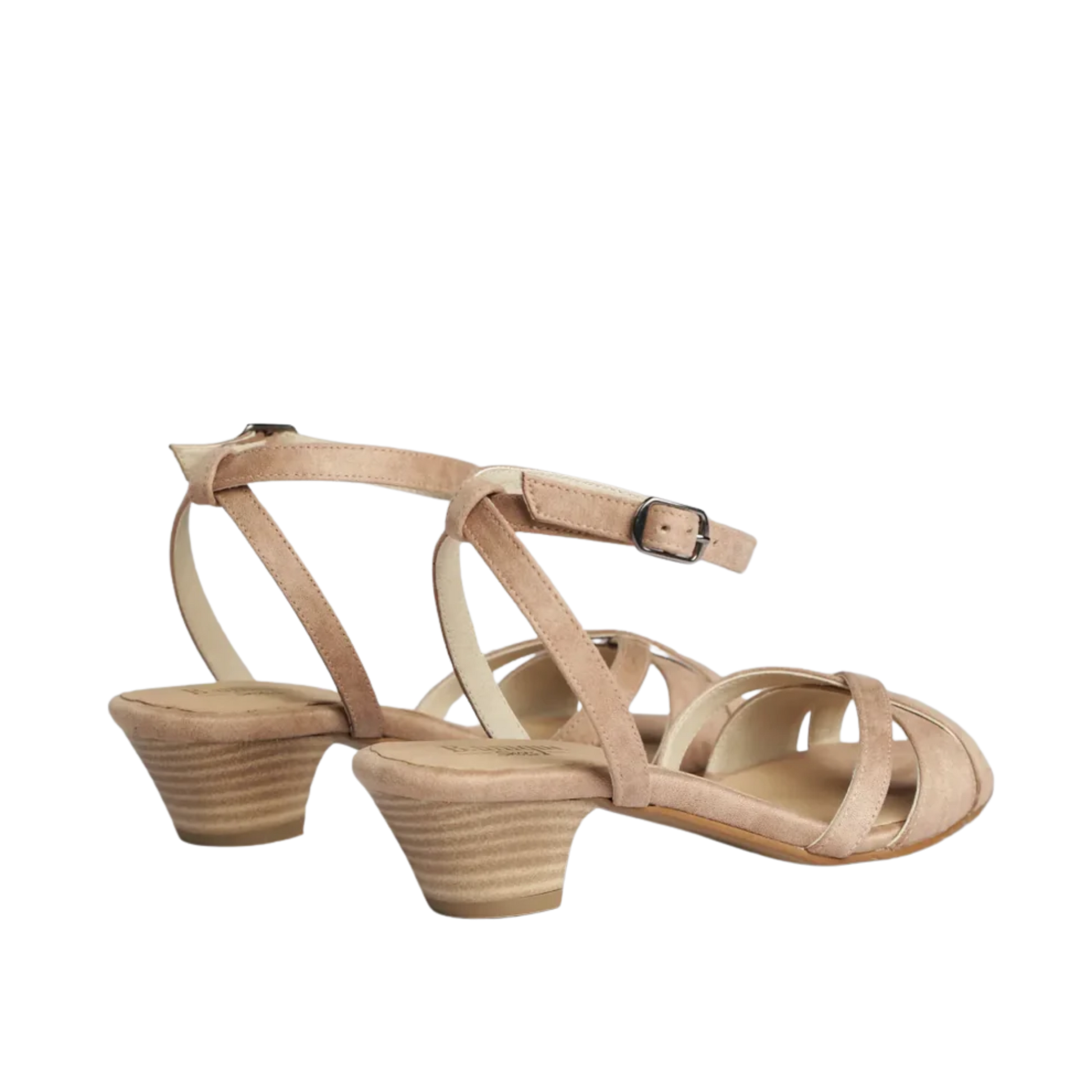 סנדל עקב קטן בעיצוב איקס עדין עם רצועות דקיקות וסגירה סביב הקרסול, עשוי מחומר דמוי עור איכותי. עיצוב שמביא לידי ביטוי אלגנטיות ופשטות בנגיעה מושלמת.